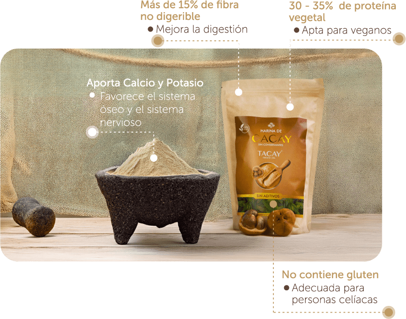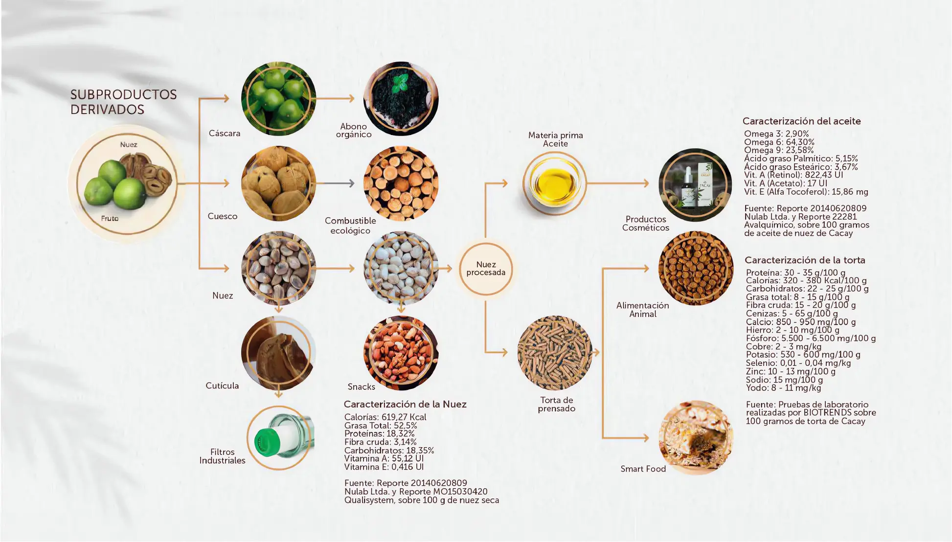 Además del aceite, se obtiene la harina de cacay con mas del 30% de proteína y con un perfil nutricional de gran valor que la convierte en un super alimento.