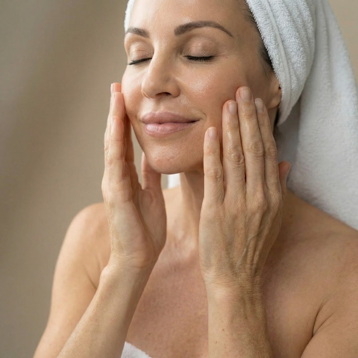 Con las yemas de los dedos de ambas manos, extender el producto de manera uniforme a ambos lados del rostro y el cuello, sin presión excesiva, con movimientos circulares y ascendentes.