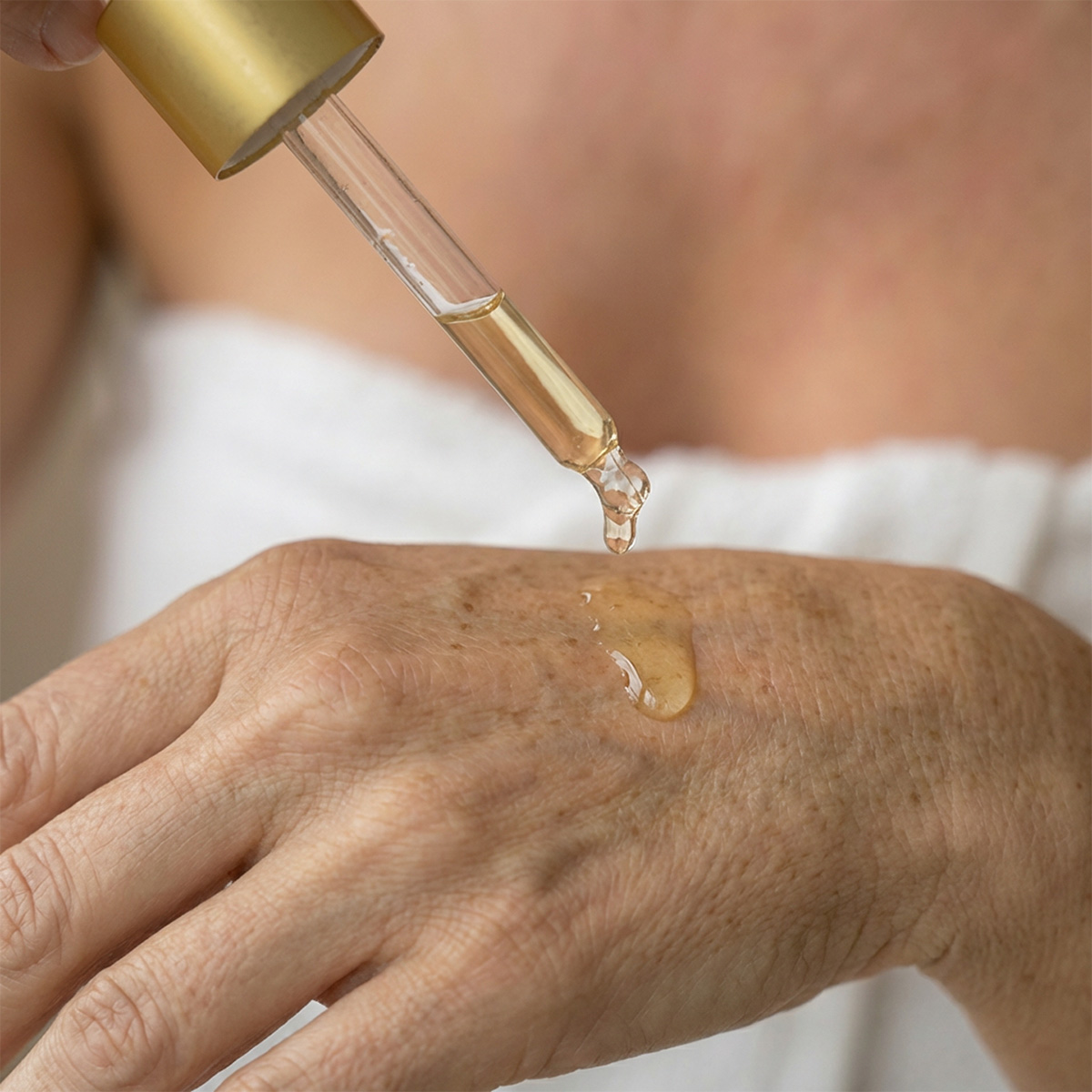 Piel: Aplique una cantidad suficiente sobre la piel limpia, dando ligeros toques en las zonas deseadas y extendiendo suavemente con las yemas de los dedos. Use por la noche para obtener mejores resultados.